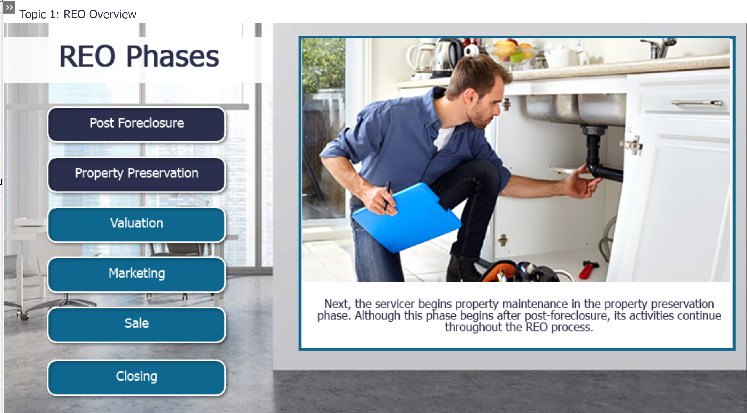 This course is more informational rather than problem oriented. REO 101 covers the basics of what happens when a property goes into default and ends up back in the hands of the lender. It is standard industry knowledge, and not proprietary software. This course walks the user through the six phases of the REO process.